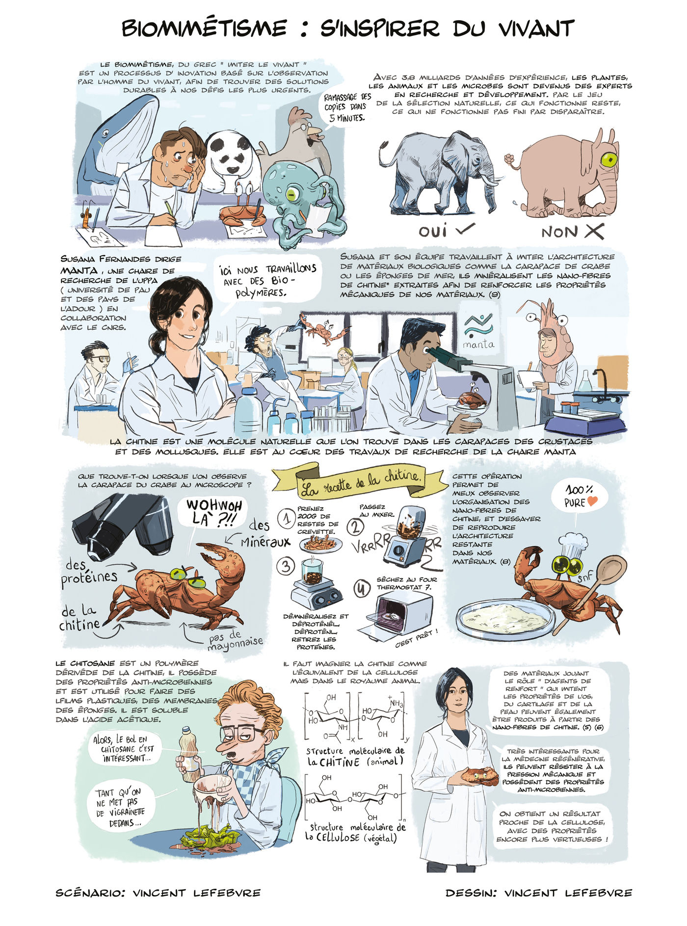 L’observation est une étape à ne pas négliger en sciences et Susana Fernandes l’a bien compris. D’une personnalité curieuse, c’est en observant la nature depuis son plus jeune âge qu’elle à commencé à s’intéresser au biomimétisme, et plus particulièrement au biomimétisme marin auquel elle voue sa carrière. Avec l’équipe de la Chaire de recherche partenariale Manta (MAriNe maTeriAls), qu’elle dirige, elle travaille sur le développement de nouveaux matériaux réduisant l’impact sur l’environnement marin. Pour atteindre ces objectifs, la chaire travaille sur deux approches : celle utilisant des matériaux des ressources d’origine marines, les biosourcés, et celle inspirés de modèles marins, les bio-inspirés.