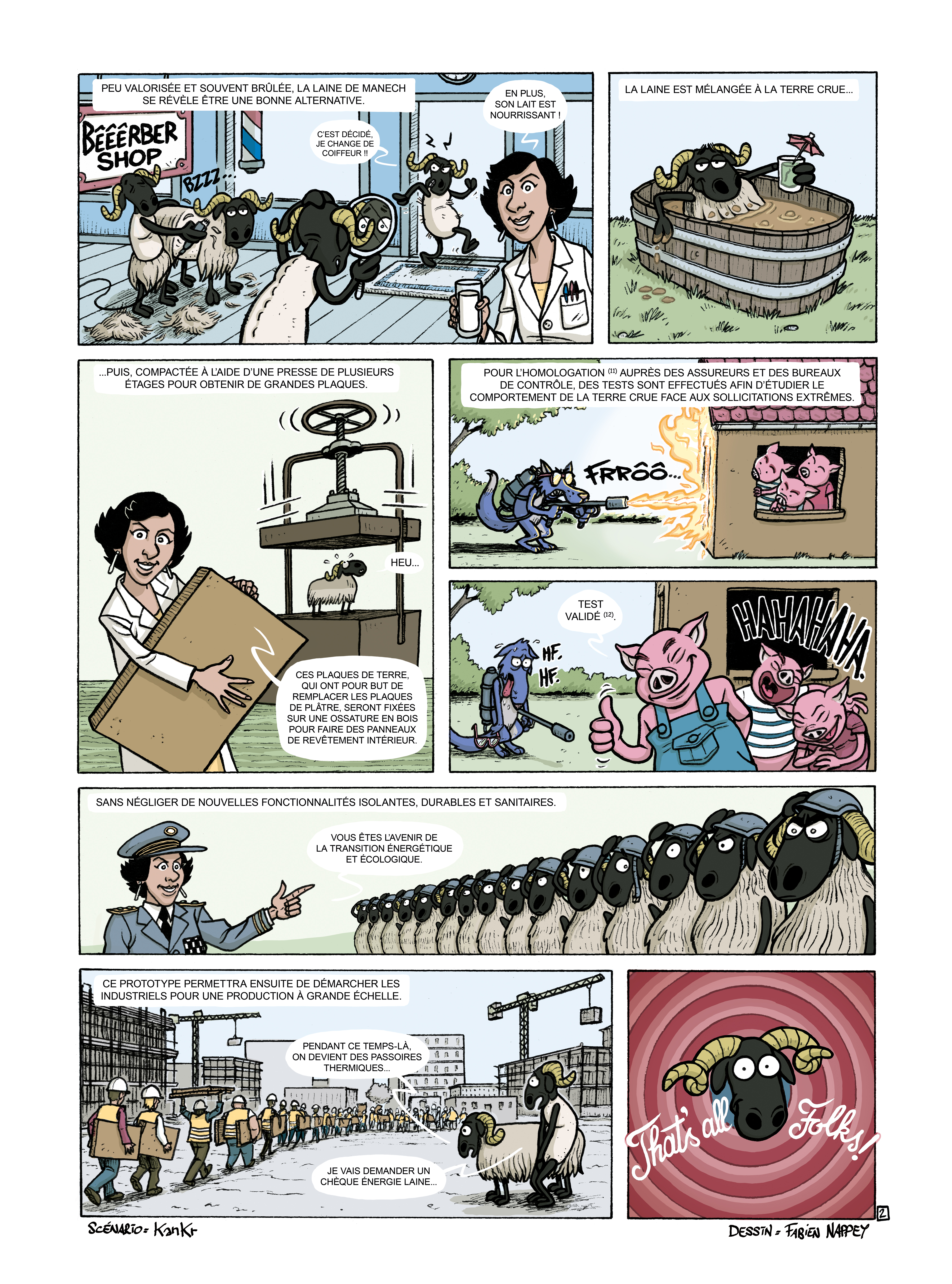En partenariat avec le centre de ressource technologique Nobatek/INEF4, l’équipe de Céline Perlot a voulu développer un nouveau matériau de construction pour le bâtiment à faible taux carbone à base de terre crue. Afin d’en tirer profit au maximum, ils ont eu l’idée de créer des plaques qui pourraient substituer celles de plâtre traditionnel dans les bâtiments. Dans l’objectif de renforcer le produit et d’assurer la solidité des plaques sans en augmenter l’épaisseur, une solution a été trouvée : le Manech. En effet, la laine de ce charmant ovin qui produit le lait pour le fromage basque n’étant pas utilisable pour le filage textile, des montagnes de laine s’entassent chez les producteurs en attendant qu’il leur soit trouvé une utilité ! Après de multiples expérimentations sur les quantités et les volumes de fibre à intégrer à la terre afin de trouver la meilleure combinaison entre solidité, régulation de la température et de l’humidité ; Céline Perlot et son équipe ont pu établir que le suint, la graisse présente sur la laine non traitée et non lavée, permettait de stabiliser les feuillets d’argile de la terre crue, et ainsi d’obtenir le matériau le plus performant. Un poids de moins dans la balance environnementale avec une économie d’eau de lavage de la laine et la suppression d’étapes dans le processus de préparation des plaques !